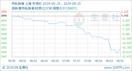 8月23日,生意社热轧板卷基准价为3214.00元/吨,与本月初(3470.00元/吨)相比,下降了-7.38%。
