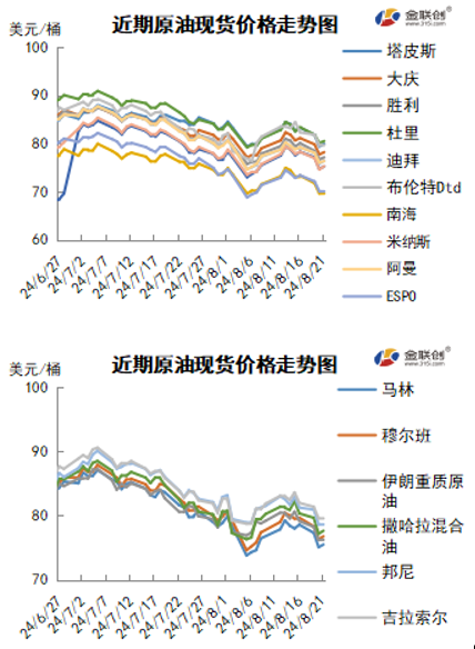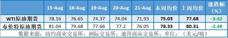 本周(8.15-8.21),原油整体呈现震荡下跌的走势,周均价环比下跌。