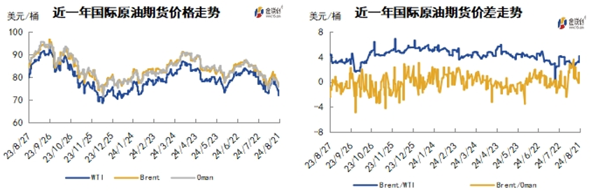 导言:本周(8.15-8.21),原油整体呈现震荡下跌的走势。WTI本周均价75.03美元/桶,较前一周下跌2.65美元/桶,或-3.42%。周内,导致油价承压的主要因素有:市场对加沙停火谈判持观望态度,投资者对能源需求前景的担忧升温以及美国经济数据不及预期。