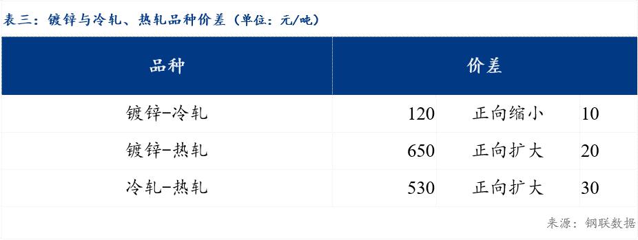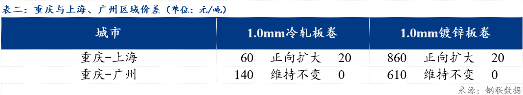 重庆、上海地区冷轧板卷区域价差扩大20元吨;重庆、广州冷轧板卷区域价差维持不变 。重庆、上海镀锌板卷区域价差扩大20元/吨 ;重庆、广州镀锌板卷区域价差维持不变。镀锌、冷轧品种价差缩小10元/吨 ;镀锌、热轧品种价差扩大20元/吨 ;冷轧、热轧品种价差扩大30元/吨 。
