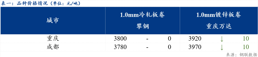 综合来看,虽市场对现阶段存在反弹预期,但终端采购计划谨慎,需求延续低位,短期内弱现实格局难改。 预计明日西南地区冷轧及镀锌板卷价格以稳为主。