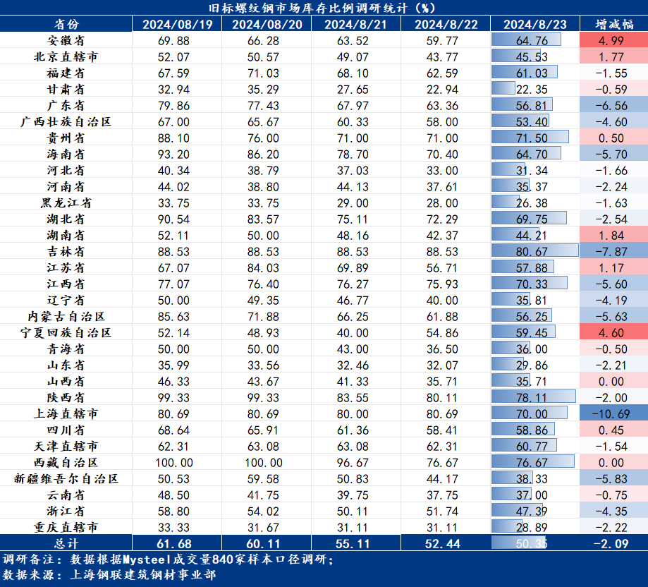 Mysteel调研:8月23日旧标螺纹钢市场库存比例日度调研追踪(分省份)