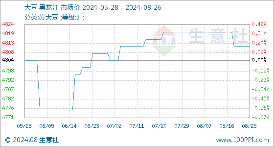 8月26日,生意社大豆基准价为4812.00元/吨,与本月初(4820.00元/吨)相比,下降了-0.17%。