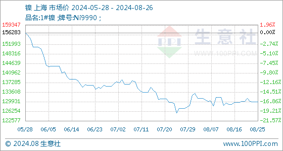 8月26日,生意社镍基准价为129766.67元/吨,与本月初(132350.00元/吨)相比,下降了-1.95%。