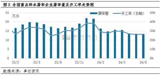 由于2023年能繁母猪产能去化叠加四季度北方冬季疫病影响,2024年生猪出栏量缩减,尤其是进入6月份后,生猪屠宰量跟随下滑。根据卓创资讯数据监测,2024年上半年全国重点样本屠宰企业日均屠宰量16.45万头,同比下滑11.40%,平均开工率为30.56%,同比下滑6.57个百分点。而8月份全国重点样本屠宰企业日均屠宰量仅有13.36万头,处近两年屠宰量最低值,导致白条猪肉供应减少,这也进一步支撑猪肉价格持续走高,且创年内价格最高值。