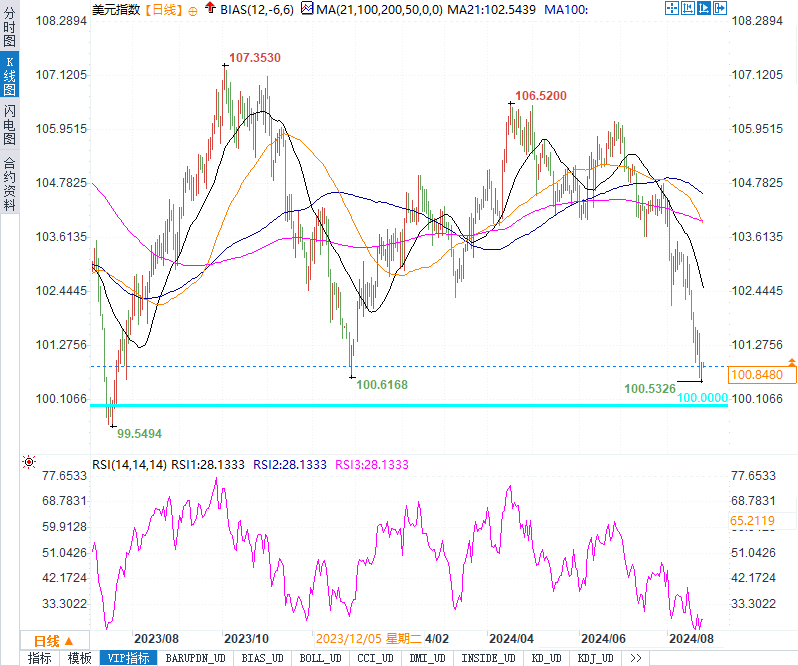 此外,美元指数也显示出疲软信号。尽管美元指数在100点水平附近寻求支撑,但若美元未能守住这一关键支撑位,则可能进一步下探下一个支撑位。考虑到美元指数自2023年初以来的整体下行趋势,技术面上看空美元的交易员或许将面临更大的获利机会。