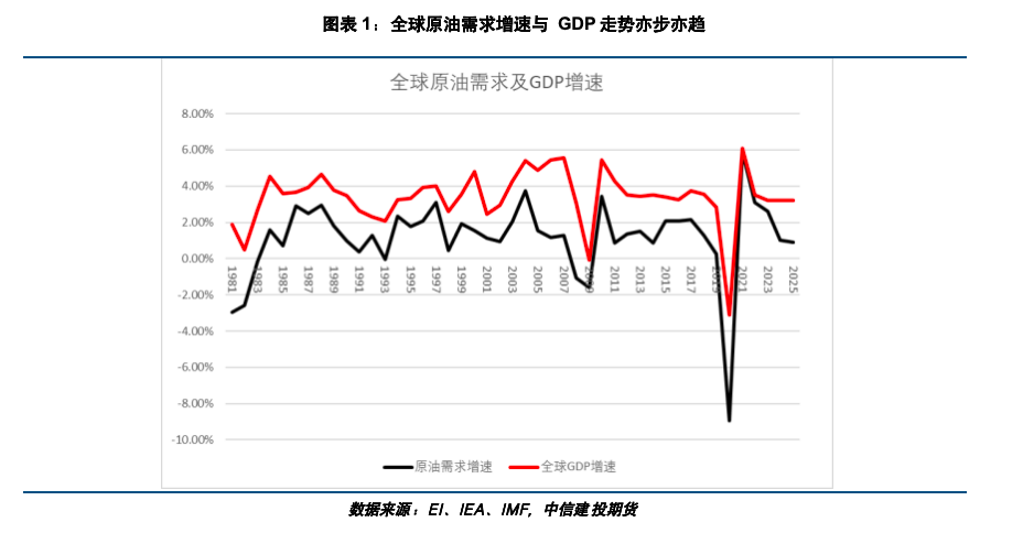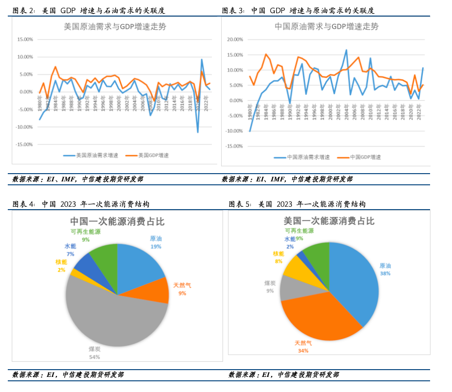 原油主要用在交通运输行业,在发达经济体中原油的需求主要集中在民众消费,在发展中经济体中,原油的需求主要集中在工业领域。原油的需求变化与GDP增长率保持高度相关。