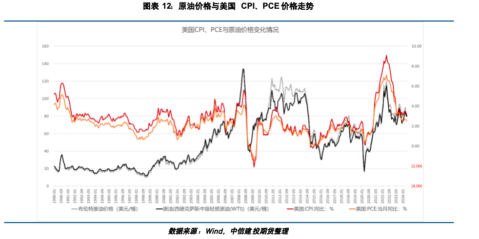 美国的重要的通胀指标CPI和PCE的同比走势与油价有非常强的关联性。能源价格在CPI中的权重比例为6.65%,同时能源价格的变动也会传导到其他核心通胀分项,美联储有研究发现,油价上涨10%大致能使核心CPI提高0.1个百分点。