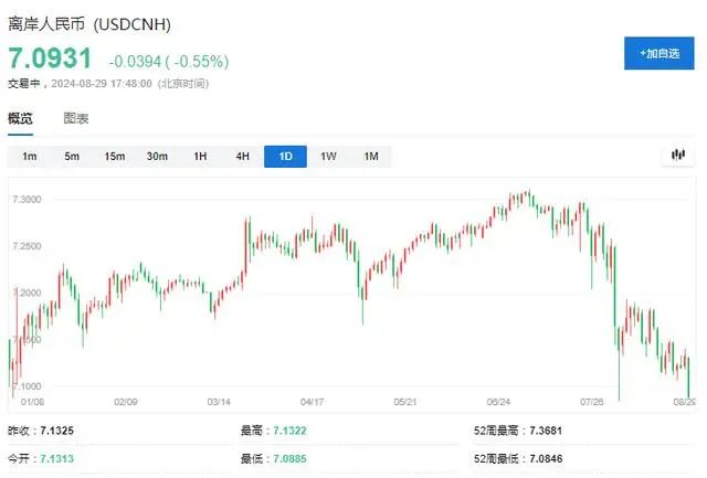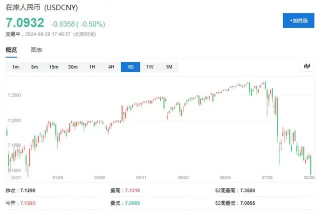 值得注意的是,8月29日盘后,离岸、在岸人民币兑美元双双升破7.10,日内涨幅逾300点,其中,在岸人民币创下去年12月29日以来的最高水平。
