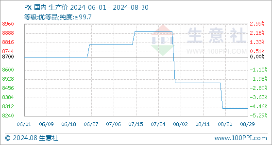 8月30日,生意社PX基准价为8300.00元/吨,与本月初(8500.00元/吨)相比,下降了-2.35%。