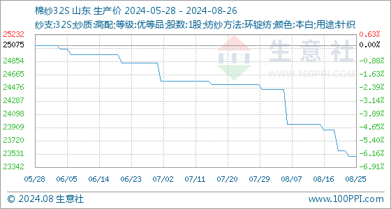 8月26日,生意社棉纱32S基准价为23500.00元/吨,与本月初(24450.00元/吨)相比,下降了-3.89%。
