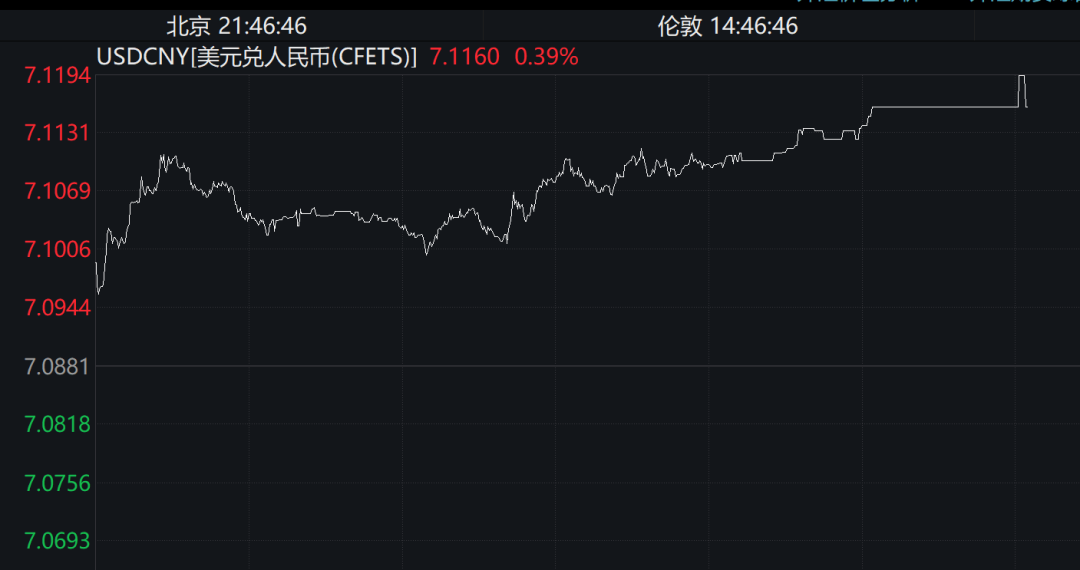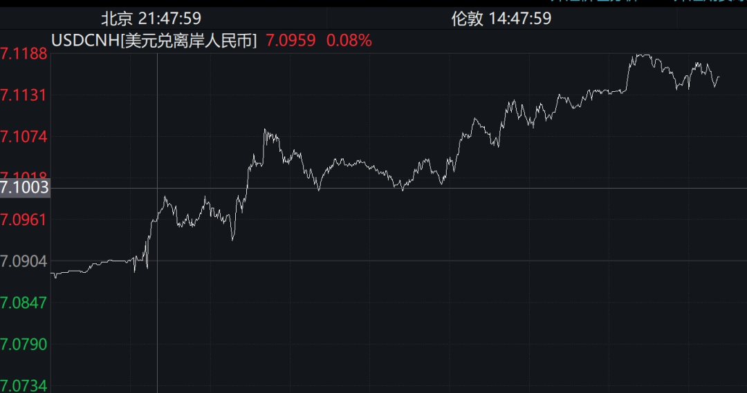 数据显示,截至21时47分左右,在岸人民币报7.1160元,离岸人民币对美元报7.0959元。同一天,人民币对美元中间价报7.1027,较上一交易日上调97个基点,但上调幅度明显收窄。