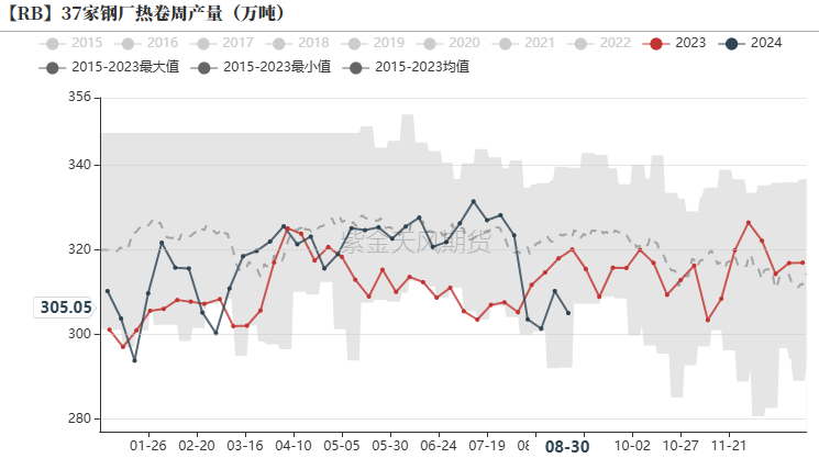 热卷消费量为305.45万吨,环比下降13.14万吨,降幅4.12%,相比于去年同期下降5.0%。