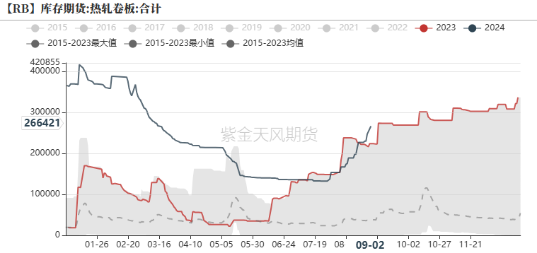 截至2024年8月30日,日均生铁产量为220.89万吨,环比下降3.57万吨(降幅1.59%);相比于去年同期下降10.5%。