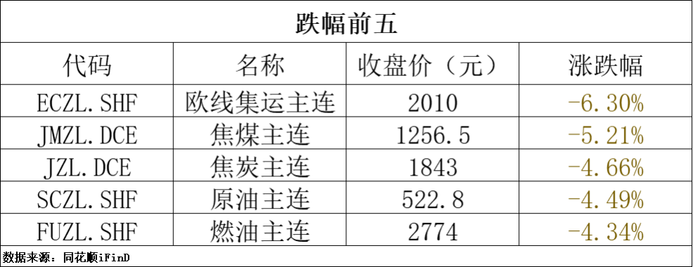 9月4日,国内商品期货大面积收跌,欧线集运跌超6%,焦煤跌超5%,焦炭、原油、燃油跌超4%;