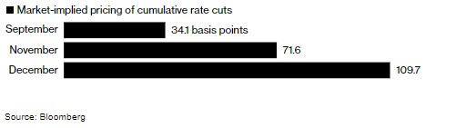 市场参与者正在加大对美联储在9月会议上大幅降息的押注。利率互换市场显示,交易员已经完全消化了美联储本月降息25个基点的预期,并且超过30%的可能性认为降息幅度将达到50个基点。此外,预计今年剩余的三次政策会议将总共降息110个基点。