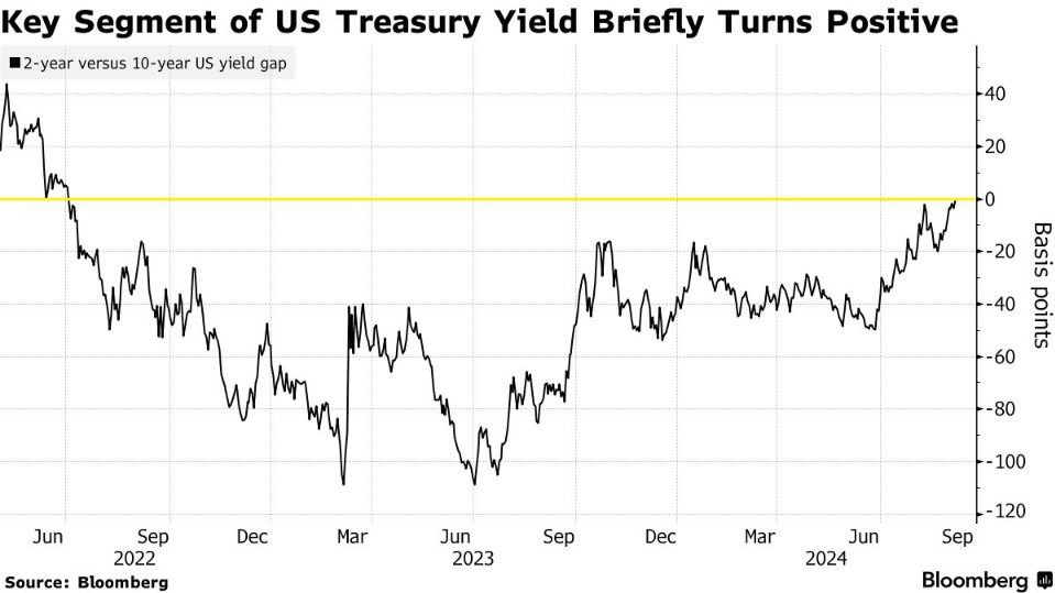 美国国债收益率曲线的一个关键部分在近期短暂转为正值,这一现象通常预示着经济前景的改善。这一转变的背后,是市场对美联储可能采取更大幅度降息措施的预期增强,这一预期受到了最新公布的弱于预期的劳动力市场数据的推动。