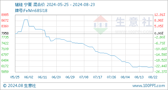 8月23日,生意社锰硅基准价为6120.00元/吨,与本月初(6580.00元/吨)相比,下降了-6.99%。