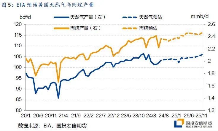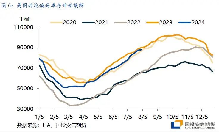 美国LPG在2023年已占我国的60.6%,成为国内第一进口来源,今年以来中东出口平稳,伊朗去年新码头带来的增量已被市场消化,因此国际市场供给增量上仍以美国为主。上半年美国天然气开始减产,使得二季度美丙烷产量有所回落,全球PG供应过剩的格局今年整体有所缓解。目前美气市场仍在剧烈波动,其价格与产量之间的负反馈使得下半年产量预期有所上调。从EIA最新预估来看,四季度内PG产量不会恢复至年初高位,至25年再度明显增长,供应端有望助力MB价格与其他市场收缩。短期来看在夏季飓风影响消退后,美国环比回落的产量和良好的出口使得其高位库存略有缓解,下半年这一改善趋势的持续性会证实其能否对国际市场起到助力。