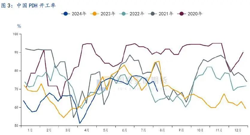 2024年上半年宏观政策有所发力,化工需求有所提振终端。自年初以来制丙烯各路线毛利持续走弱,市场需求偏弱,二季度后终端产品价格率先走高,从而各路线的毛利水平均有所修复。今年我国PDH仍处于投产高峰,全年计划投产约611万吨产能,预计至年末使得国内产能增长至2479万吨/年,上半年已投产或试运行装置约在316万吨,从投产进度来看好于过去两年,延期程度显著降低,反应了化工市场预期的回暖。上半年国内进口LPG量在1719万吨,较去年同期增加11.8%,增长量为30.1万吨/月,基本对应PDH新产能规模,反应了我国PG需求增量基本由PDH驱动的特点。