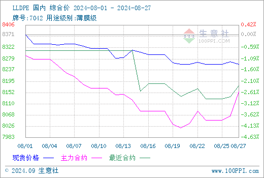 据生意社商品行情分析系统监测,LLDPE(7042)8月20日国内价格在8260元/吨,8月27日均价在8260元/吨,期间报价持稳。
