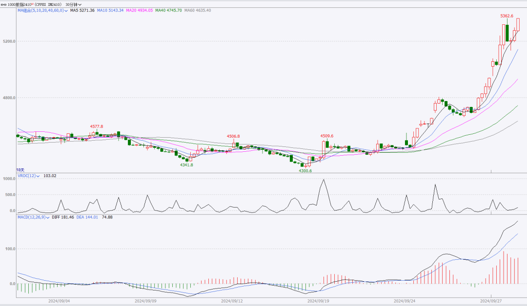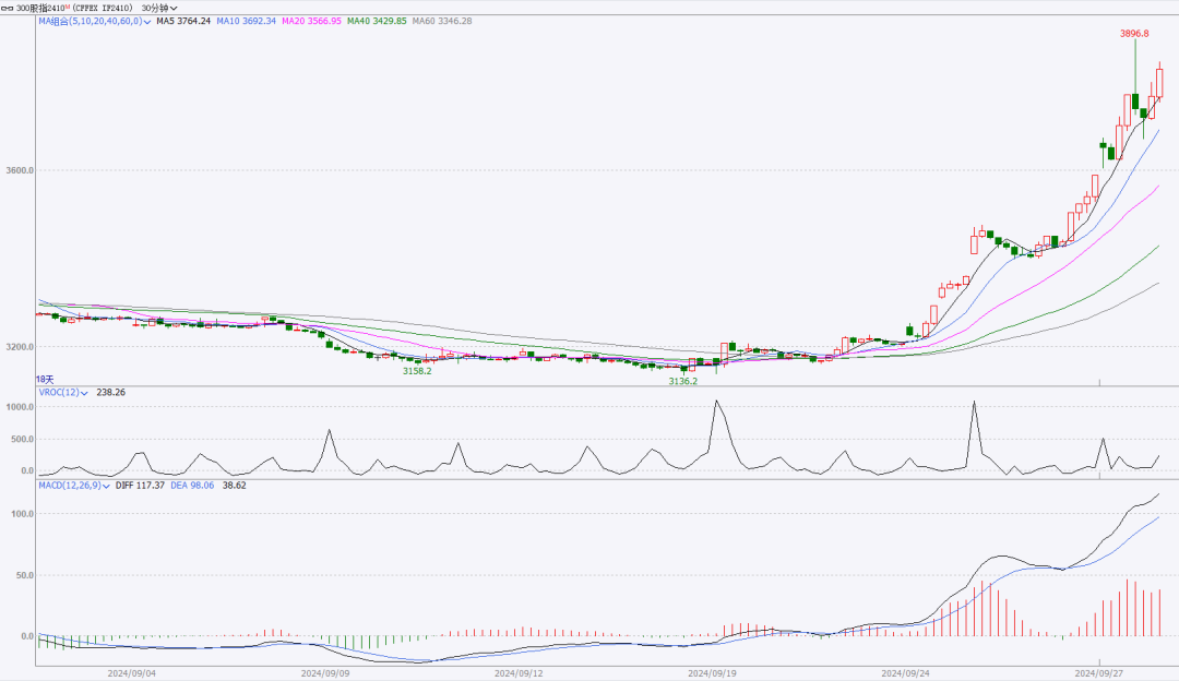 在接连受到宏观政策层面的刺激之后,市场信心大幅恢复,股指纷纷大涨,其中IF指数大涨超8%,IC,IM一度触及涨停。