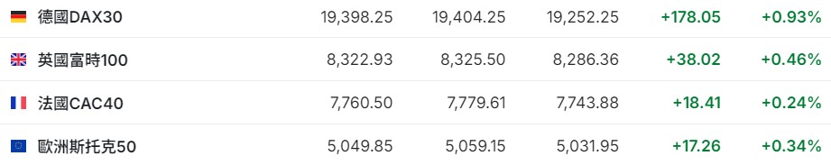 2. 截至发稿,德国DAX指数涨0.93%,英国富时100指数跌0.46%,法国CAC40指数涨0.24%,欧洲斯托克50指数涨0.34%。