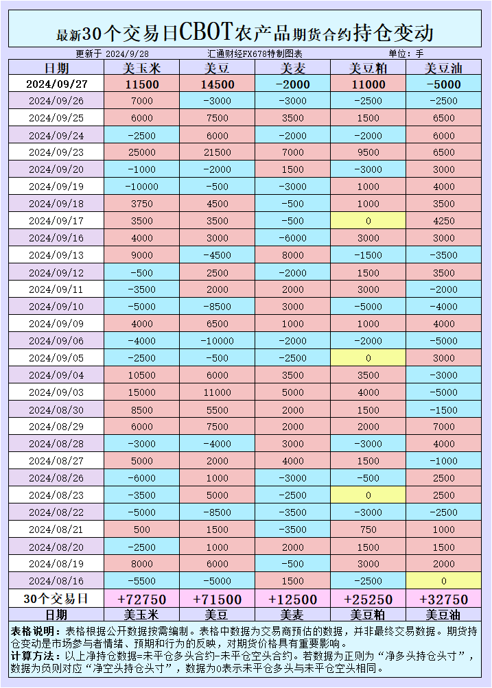 增加CBOT玉米投机性净多头;增加CBOT大豆投机性净多头;增加CBOT小麦投机性净空头;增加CBOT豆粕投机性净多头;增加CBOT豆油投机性净空头。