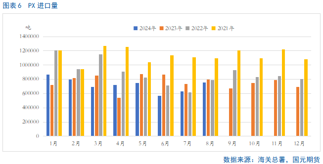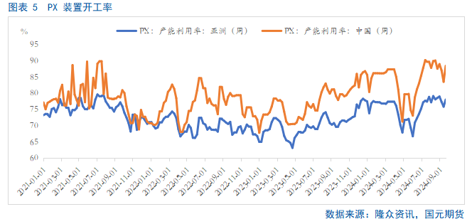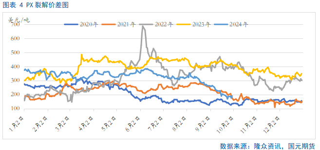 今年以来,外围市场调油需求不及预期,叠加三季度国内外市场PX装置开工率达到近三年同期高位,因此供应端大幅走高,压制盘面价格一路下挫。据统计,2024年前8个月国内PX产量2469万吨,同比增加16.3%。在供应量持续走高的背景下,9月份国内的PX裂解价差已下破200美元/吨,产业链的利润不断下终端转移。截至9月23日,PX裂解价差最低下探至175.25美元/吨,而上半年PX和石脑油裂解价差在300-400美元/吨波动。