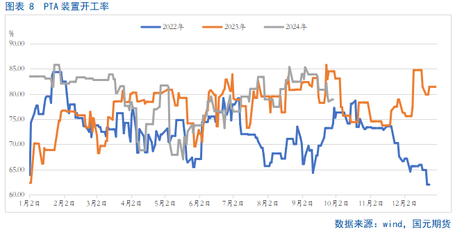 据中国海关统计,按美元计,今年前8个月,我国纺织服装累计出口达到1977.7亿美元,同比增长1.1%,增速较上半年有所放缓,其中纺织品出口930.7亿美元,同比增长3.5%,服装出口1047.1亿美元,同比减少1%,增速均超过全国货物贸易出口增幅。当前我国纺织行业出口依然面临有效需求不足、市场竞争加剧、地缘政治不稳定不确定性增多等风险挑战。从国内市场来看,需求端恢复保持温和态势,不过也难有亮点呈现。因此综合来看,四季度终端纺织业对 PTA 的支撑传导有限。