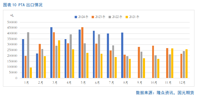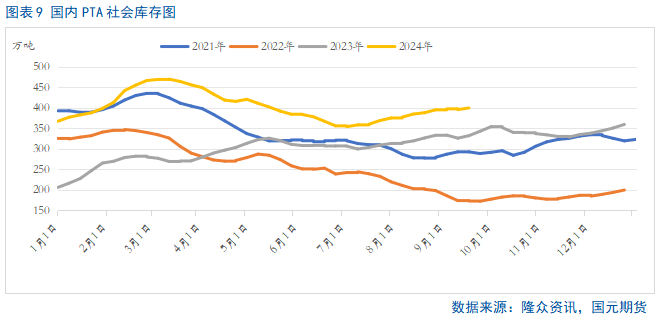 2024年一季度伴随着450万的PTA装置投产,国内的PTA产能增长至8517.5万吨。三季度在PTA高基数、行业高开工的背景下,而下游聚酯市场整体需求一般,导致PTA再度步入累库格局。不过值得一提的是,今年国内PTA的出口量达到了近几年同期高点,因此国内PTA社会库存累库幅度略有收窄。截至9月下旬,国内PTA社会库存量逼近400万吨左右,达到近几年同期高位。