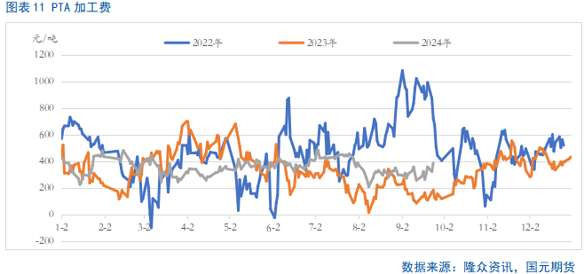 据海关数据统计,2024年1-8月份我国PTA的出口量达到304.34万吨,较去年同期上涨24.1%。虽然印度的BIS出口认证到期且并未获得续签,今年以来中国PTA出口至印度的数量大幅走低,但是出口至越南、埃及、巴基斯坦等国家的PTA数量稳中有升,抵消对印度的降幅,所以对供给端压力有一定的缓解。但是考虑到产量的增幅,出口虽有消化部分压力,但是较为有限,后续还需要关注实际出口情况。从加工费来看,三季度下旬,国内PTA加工费呈现出修复的局面。