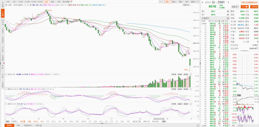 10月8日豆一主力期货(AM)合约收盘下跌4.38%,报4016元,成交60.42亿元。