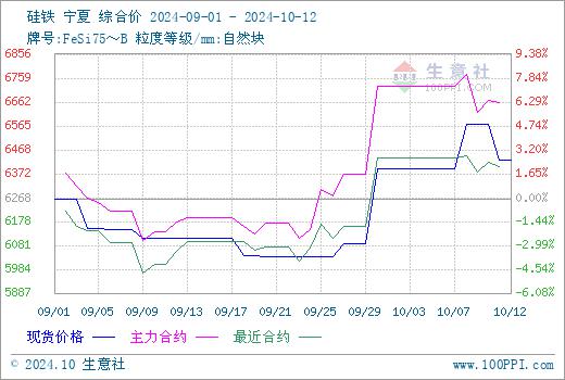 节前业内情绪高涨,期现双双翻红,整体表现火热一片,针对节后“银十”多数也是寄予一番厚望,但预期并未兑现,叠加目前为止未有明显的利好政策出台银十开局并不利,硅铁期货短暂冲高过后快速滑落。据生意社商品行情分析系统,10月12日硅铁(牌号:FeSi75~B;粒度等级/mm:自然块)宁夏地区市场报价在6400-6500元/吨,较节前降2.20%。