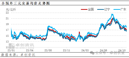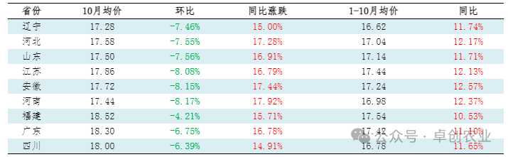 本月国内生猪价格整体呈涨后震荡下行趋势,月均价环比下跌。据卓创资讯监测,本月全国外三元交易均价17.66元/公斤,环比跌幅6.95%,同比涨幅16.80%。1-10月份全国外三元交易均价16.88元/公斤,同比涨幅11.94%。本月生猪期货主力合约2501震荡下跌,31日收盘价15175元/吨,基差2085元/吨。本月生猪价格整体呈现涨后震荡下行趋势。国庆节期间价格处于相对低位,二次育肥热度渐起,支撑生猪价格上行;节后进入中旬,伴随着猪价的上涨,二次育肥补栏成本提升,热度由此下滑。而后养殖端按照计划正常出栏,但需求端接货力度有限,市场处于供过于求态势,猪价止涨转弱;进入下旬,猪价并未有明显好转,因此部分企业压栏心态减弱,出栏节奏加快,猪源陆续出栏;而需求端亦无明显支撑,白条走货乏力依旧,下旬猪价延续弱势,仅月末当天部分养殖端缩量,支撑猪价反弹,但由于下游接货积极性一般,涨幅极为有限。