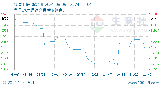 11月4日,生意社沥青基准价为3486.00元/吨,与本月初(3522.67元/吨)相比,下降了-1.04%。