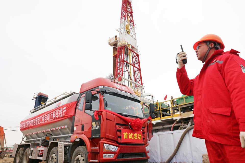 道路运输有“绿色”专列,施工现场更有环保“神器”。在邵548-斜11井施工现场,该公司自主研发的工业盐自动上料设备,将70吨工业盐通过罐车绞龙直抵钻井液循环罐口,不到2小时便完成全部加注。今年以来,“零包装、零固废、零扬尘、零泄漏”的钻完井处理剂“绿色加注”新模式,累计减少包装袋9.7万个。