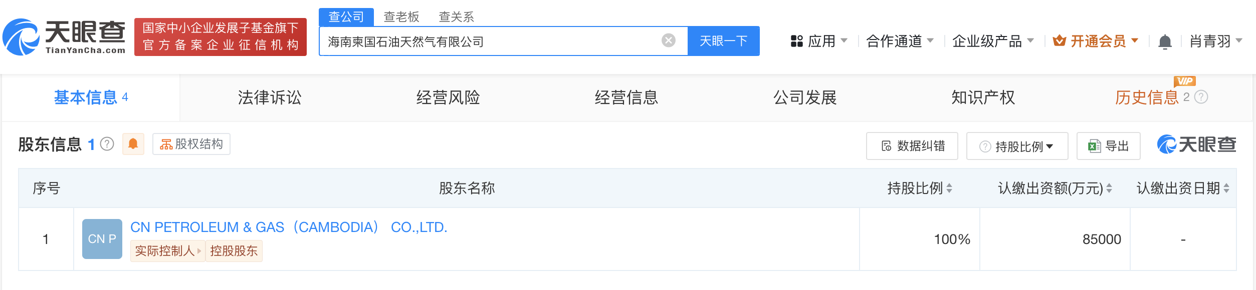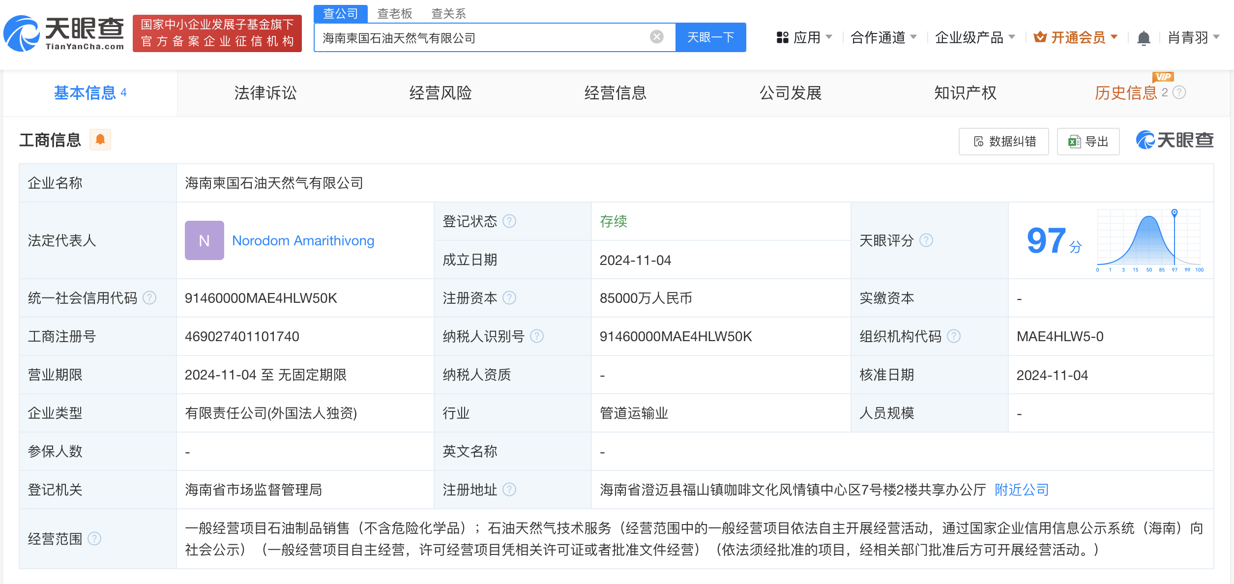 每经AI快讯,天眼查App显示,11月4日,海南柬国石油天然气有限公司成立,法定代表人为Norodom Amarithivong,注册资本8.5亿人民币,经营范围为石油制品销售、石油天然气技术服务。股东信息显示,该公司由CN PETROLEUM&GAS(CAMBODIA)CO.,LTD.全资持股。