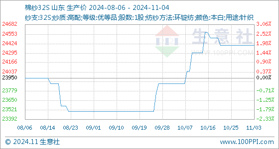 11月4日,生意社棉纱32S基准价为24400.00元/吨,与本月初持平。