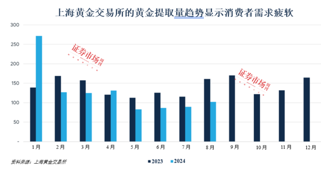 步入2024年第一季度,市场需求开始放缓,这可能是消费者信心疲软和金价持续攀升影响了黄金首饰消费。截至2024年第二季度末,上海黄金交易所黄金挂牌价格约为每克550元人民币,较2023年9月上海金溢价高点时上涨约15%。