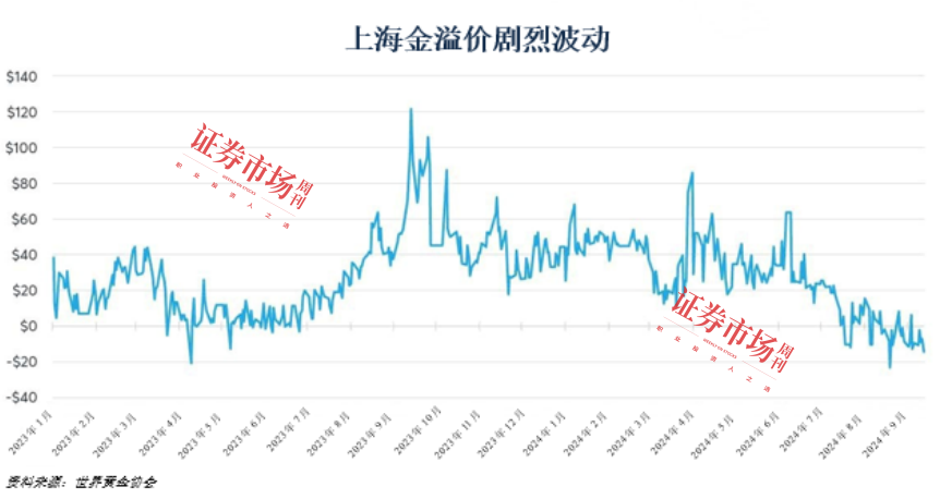 2023年初,上海金溢价约为每金衡盎司40美元,并在2023年9月14日触及每金衡盎司121.2美元的历史高点。然而仅仅在一年多以后,溢价徘徊在每金衡盎司负10美元左右,较高点下挫逾130美元。其中原因几何?