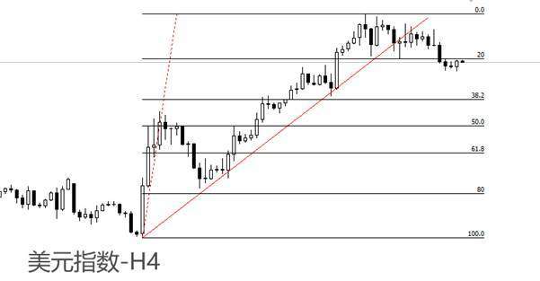 四小时周期看,美元指数经历一轮上涨之后,于15日17:00跌破上涨趋势线,开启回调走势。按照黄金分割理论,下方支撑位分别为S1:105.6、S2:104.7、S3:104,当前市价106.2,距离第一支撑位仍有一段距离。美元指数短线会跌至哪一支撑位,取决于市场预期和情绪的变化。本周数据面重要性较低,鲍威尔尚未有公开讲话安排,技术面主导行情走势概率较高。据此判断,回调低点出现在S1至S2之间的概率较高。