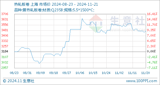 11月21日,生意社热轧板卷基准价为3470.00元/吨,与本月初(3560.00元/吨)相比,下降了-2.53%。
