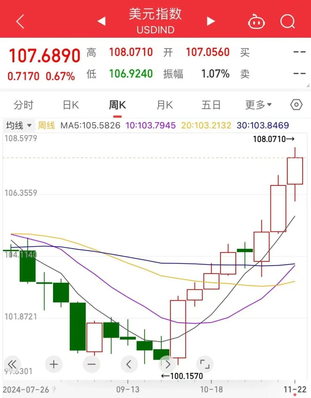 22日晚,美元指数盘中一度飙升约1%,升破108,创2年来新高。该指数已连续8周上涨,本月以来上涨约2.5%,在10月近3%的涨幅基础上继续攀升。
