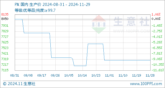 11月29日,生意社PX基准价为7300.00元/吨,与本月初持平。