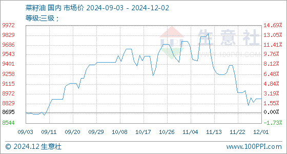 12月2日,生意社菜籽油基准价为8905.00元/吨,与本月初持平。