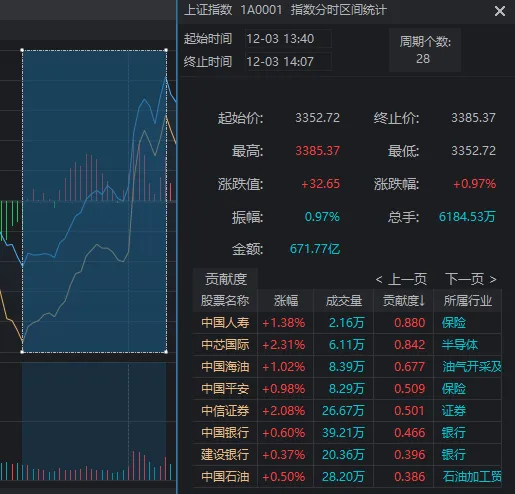3)从止跌回升的13:40算起,最早翻红的上证指数中,来自保险、银行、证券等大金融方向的权重股,贡献度纷纷居前。