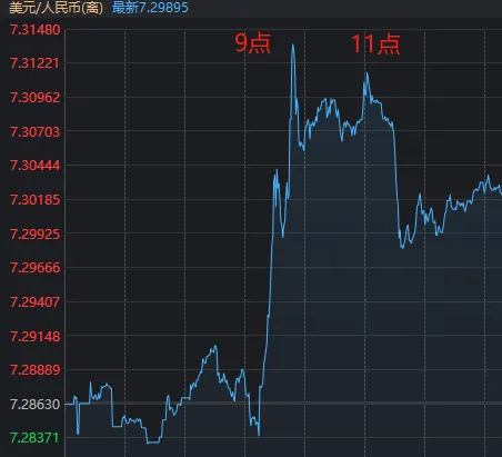 此后,人民币汇率渐渐震荡回升,离岸人民币兑美元于14:44收复7.30关口。