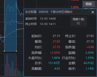 2)券商股这时也扎堆放量。东方财富11分钟成交了42亿元。