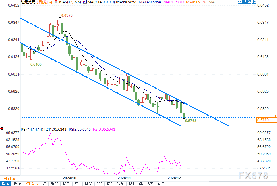 12月11日周三欧洲交易时段,纽元兑美元连续第二天下跌,交易价格约为0.5770。技术方面,分析师Faruqui进行了以下解读: